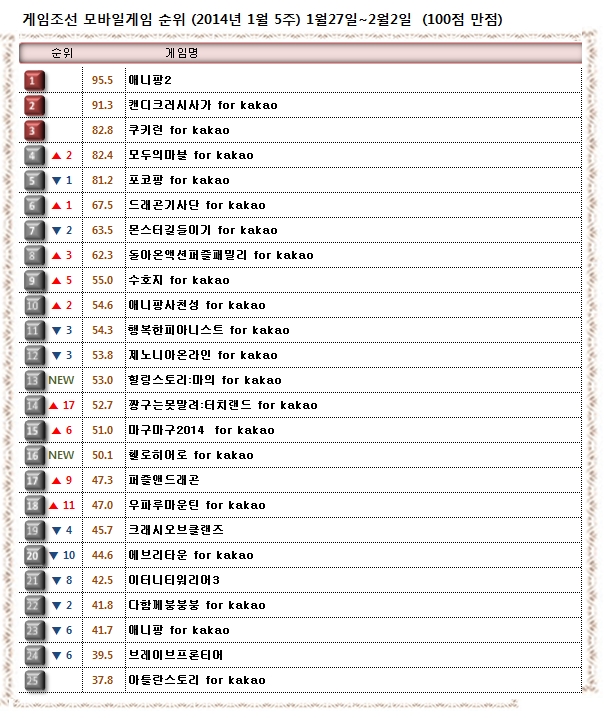 ... 1월 다섯째 주(2014년 1월 27일 ~ 2014년 2월 2일) 모바일게임 순위입니다. 1월 다섯째 주 게임조선 모바일게임순위에서 ‘애니팡2’가 원조 퍼즐게임 ‘캔디크러시사가’를 누르고 1위를 차지했다. ‘캔디크러시사가’는 2위를 기록했으며 그 뒤를 ‘쿠키런’과 ‘