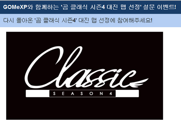 ... ‘GOM 클래식 시즌 4’에 사용되는 맵은 총 5개로 시청자들에게 인기가 많았던 맵들로 채워질 예정이다. ‘투혼’과 ‘타우크로스’가 기본맵으로 정해졌으며 시청자 투표를 통해 3개의 맵이 더해진다. 많은 명경기를 탄생시켰던 6개의 맵이 후보에 올랐다