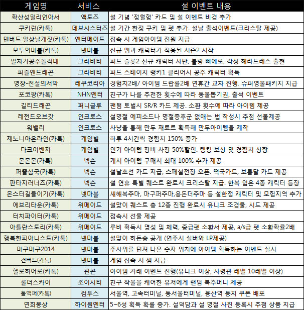 ... 바로 최근 '핫'한 돌풍을 일으키는 스마트폰 기반 모바일게임 업체들이 설을 맞아 각종 이벤트를 진행하며 혜택과 즐거움을 선사하고 있다. ◆ 2014 설 연휴 모바일게임 이벤트 모음 모바일게임 특성상 대부분 이벤트가 접속할 때각종 혜택을 지급하거나 설과 관련된 사냥터