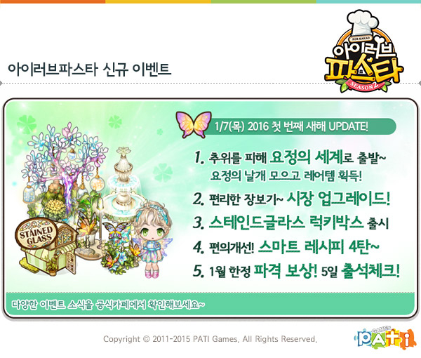 ... 또 스테인드글라스 요정나무와 페어리 헤어 및 드레스 등 총 9종의 아이템으로 구성된 스테인드글라스 럭키박스가 새롭게 등장했다. 더불어 요리 재료 수급을 위해 방문했던 '시장'과 여러 아이템을 획득할 수 있는 '안나의 쇼핑몰'이 보다 빠르고 편리하게 이용할 수 있도록 개선되었
