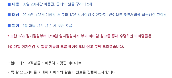 ... 보상 대상 이용자들은 29일 임시점검 시 일괄 지급받는다. 오크 서버 모든 이용자를 대상으로 한 이벤트도 4종 진행된다. ▲ 먼저 변신 이벤트로 ‘영웅의 모습으로 탈바꿈 하자!가 오는 29일부터 내달 12일까지 진행된다