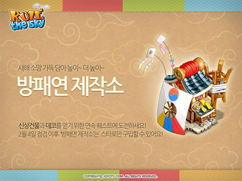 ... 이달 30일부터 내달 2일까지 게임에 접속한 유저에게 매일 30’스타(게임캐시)’씩을 선물하고, 내달 11일까지 총 15개의 미션으로 구성된 설 맞이 연속 퀘스트를 모두 완료한 유저에게 ‘방패연 제작소’ 건물을 지급한다. 김청용 조이시티 라이브사업본부 본부장은 “설 분위기 나