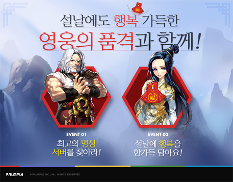 ... '삼국용팝' 설 첫 선물은 명장 고용 이벤트다. 내달 6일까지 삼국지의 명장 관우와 황승언, 관봉을 고급 초대를 통해 고용할 수 있고 이에 따른 선물상자가 제공된다. 같은 기간 매일 출석만 체크해도 출사표, 1류 무장조각, 은화, 모집/뽑기령, 깃발 등이 포함된 설날 패키지