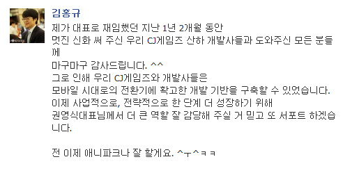... 이로써 김 전 대표는약 1년 2개월간의 CJ게임즈 대표직을 물러나 원래의 보금자리인 애니파크로 되돌아간다. 그는 "재임 기간 동안 멋진 신화를 써 주신 CJ게임즈 산하 개발사들과 도와주신 모든 분께 감사드린다"며 "이제 사업적으로, 전략적으로 한 단계 더 성장하기 위해 권영식 대