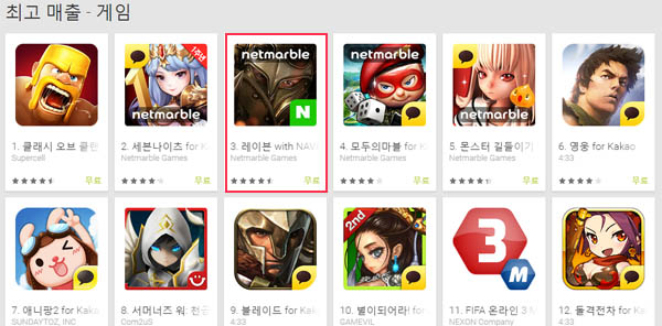 ... 이는 전날 7위에서 4계단 상승한 수치로 출시 3일차에 3위에 입성한 레이븐은 올해 출시된 모바일게임 가운데 가장 빠른 순위 상승을 기록했다. ▲ 2015년 3월 15일 구글 플레이 마켓 게임 부문 최고 매출 순위 레이븐은 휴먼-엘프-반고 세 캐릭터 가운데 하나를