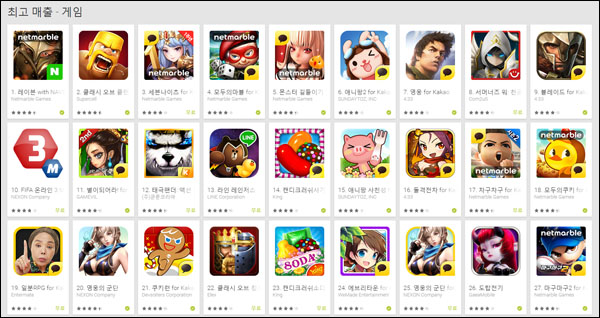 ... 지난 14일 국내 출시된 '탑탱'은 21일 구글 매출 9위에 오른 뒤 엿새간 9위에 머물렀으나 출시 2주차를 맞아 27위 순위는 3계단 상승한 6위를 차지한 것. ▲ 2015년 4월 27일 구글 플레이 게임 부문 최고 매출 순위 이와 같은 순위 상승은 통상 주말이