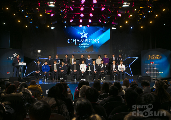 ...이날 행사에는 롤챔스에 참석하는 10개 게임단의 감독 및 대표 선수가 참여했으며, 각 팀 감독들은 추첨을 통해 대진표를 완성했다. 개막전 첫 경기에서는 SKT T1과 CJ 엔투스가 맞붙게 됐다. 이번 개막전은 작년 롤챔스 및 롤드컵 우승을 싹쓸이한 '최강' SKT T1과 파격적인