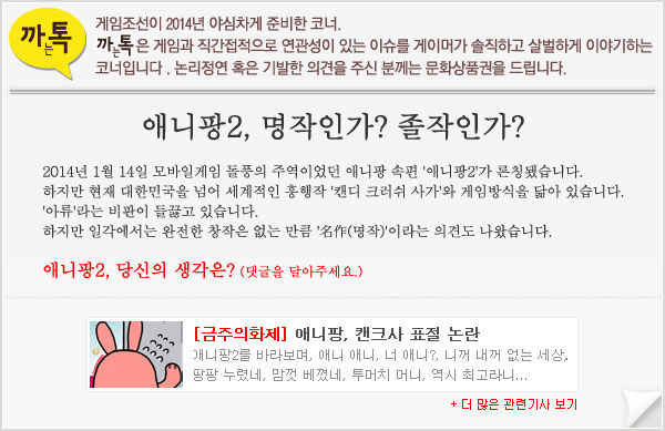... “애니팡2, 명작인가? 졸작인가?”라는 논제에 맞게이용자는 자유롭게 의견을 개진하면 된다. ‘까는톡’은 (http://www. gamechosun