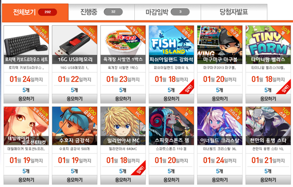 ... 유저들이 헝그리앱 사이트에 올리는 댓글과 리뷰, 게임 소식들에 마일리지를 차등 지급하며, 마일리지로 상품 응모권을 구매, 한장씩 응모하거나, 획득한 응모권을 모두 응모하는 식으로 원하는 상품에 응모할 수 있다. 각 상품별로 당첨자 발표가 다르기 때문에 유저들은 이에 대해 유의