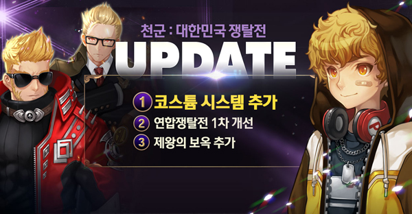 ... 헤어, 복장 등 코스튬 착용 시 능력치가 향상된다. 아울러 연합쟁탈전에 대한 개선이 이뤄졌다. 연합쟁탈전 진행 조건이 조정되고 공성무기 기능이 추가됐으며, 거점 보호막 시간이 상향됐다