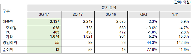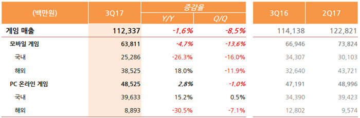 ...5% 감소한 수치다. 플랫폼 별로 살펴보면 모바일게임은 '라인디즈니쯔무쯔무' 등 인기작들의 자연감소가 나타나며 전년 동기 대비 4. 7%, 전 분기 대비 13