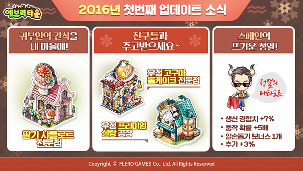... 플레로게임즈는 업데이트를 기념해 10일까지 저녁 6시부터 12시까지 접속한 이용자들에게 50만 골드, 100하트, 시드(게임머니), 일손돕기 쿠폰 등 각종 혜택이 주어지는 새해 맞이 접속 이벤트를 진행한다. 또 1월 31일까지 기존 메인타운과 함께 이용자가 직접 경영할 수 있