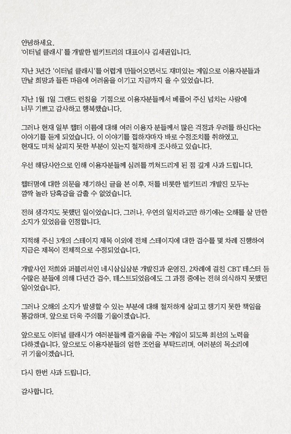 ... 특히 회사 대표까지 나서서 사과의 뜻을 전하자 이용자들의 불만도 다소 누그러진 모습이다. 5일 김세권 벌키트리 대표와 소태환, 장원상 네시삼십삼분(4:33) 공동 대표는 신작 '이터널클래시' 공식 카페를 통해 최근 불거진 일련의 사태에 대해 정식 사과했다. 이터널클래시는