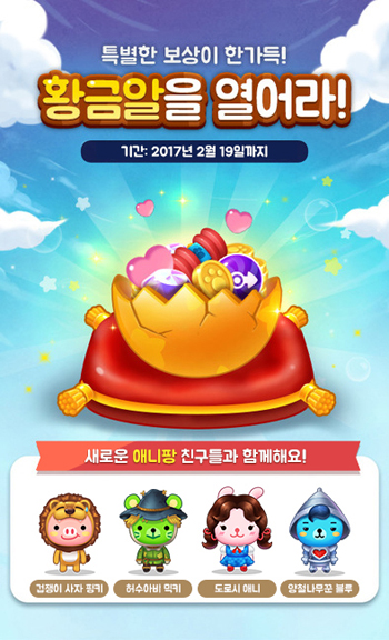 ... 여기에 '겁쟁이 사자 핑키' '허수아비 믹키' 등 한정판 캐릭터와 '도로시 애니' '양철나무꾼 블루' 등 신규 캐릭터가 등장했다. 회사측은 '황금알 이벤트'를 통해 오는 19일까지 황금알 스테이지에 도달하면 신규 아이템인 마오팡을 비롯해 하트, 회전팡, 뿅망치 등 인기 아이템을
