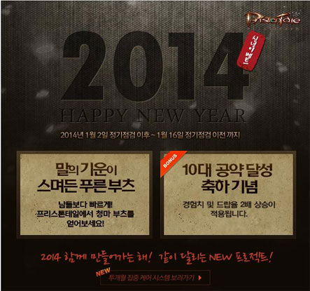 ... 또 2013년 10대 공약 달성 축하와 함께 2014년의 새로운 약속 달성을 기원하며 2주간의 이벤트 기간 내내 경험치와 아이템 드랍율을 2배로 상승 적용한다. 와이디온라인 측은 "2014년에는 이용자들의 의견에 더욱 귀 기울이겠다는 마음으로 '투개월 집중 케어 시스템'을