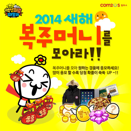 ... 유저는 게임 접속 시 보여지는 첫 화면에서 보여지는 배너 또는 게임 내 이벤트 아이콘을 통해 본인의 누적 ‘복주머니’ 수량을 확인할 수 있다. 경품은 ‘캐나다구스 익스페디션’ ‘아이패드에어 16GB’ ‘피자 교환권’ ‘문화상품권’이 준비됐다. 추첨에 당첨될 확률은 응모를