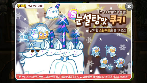 ... 이번에 추가된 눈설탕맛 쿠키는 일정 시간마다 장애물을 부수고 눈꽃젤리를 생성하는 스노우콘 소환수를 소환하고 눈꽃젤리를 모으면 눈보라를 일으키는 스노우킹 소환수를 불러내는 능력을 갖고 있다. 이는 게임 내 캐시아이템인 크리스탈 119개로 구매할 수 있으며 S급 보물 12개를 보유
