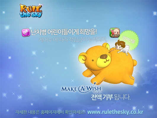 ... 또 게임 내 ‘Make-A-Wish(메이크어위시)’ 퀘스트를 완료한 유저 전원에게 이번 기부 캠페인을 기념해 특별 제작된 ‘위시베어’ 데코 아이템을 선물로 증정한다. ‘한국메이크어위시재단’은 생명의 위협을 받는 난치병 아동들에게 소원성취를 통해 삶의 희망, 용기, 기쁨을 전