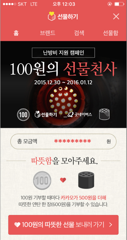 ... 600원은 연탄 한 장 가격을 기준으로 책정됐다. 이벤트에 참여한 이용자가 카카오톡 친구에게 이벤트 페이지 링크를 공유하고, 해당 친구가 이에 방문하기만 해도 방문자 1인당 100원을 카카오가 추가로 기부한다. 예를 들어 A씨가 100원의 기부 쿠폰 한 장을 구매하면 카카오가 5