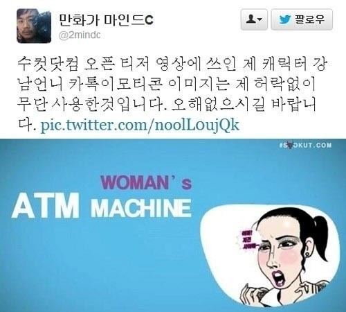 ... 앞서 마인드C는 지난 20일 “수컷닷컴 오픈 티저영상에 쓰인 제 캐릭터 강남언니 카톡 이모티콘 이미지는 제 허락 없이 무단 사용한 것입니다. 오해 없으시길 바랍니다”라는 글을 올린바 있다. 이와 관련 변희재 미디어워치 대표는 “해당 동영상은 회원이 제공한 것인데 솔직히