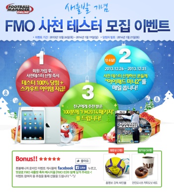 ... 공식 웹사이트에서 회원가입 및 테스터 신청을 마친 전원에게 별도의 추가 절차 없이 테스터로 당첨되는 혜택과 함께 게임 아이템을 지급한다. 또한 금일부터 12월31일까지 사전 테스터 신청자를 대상으로 매일 추첨을 진행해 '아이패드 미니 2'를 지급하며, 테스터 신청 후 2