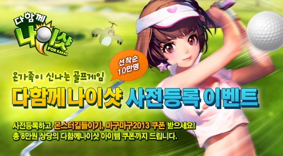 ... 넷마블은 '다함께나이샷' 출시일까지 특별 페이지(enjoy. netmarble. net/_event/mobile/2013/1204)를 통해 다운로드를 예약하는 이용자들 중 선착순 10만 명에게 이벤트 쿠폰을 제공한다
