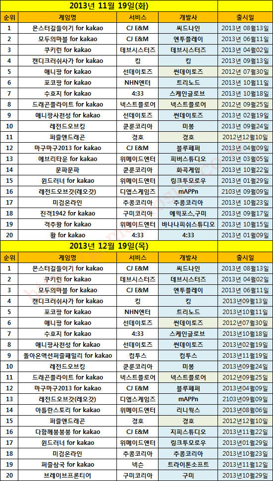 ... <편집자 주>11월과 12월 구글 플레미 마켓 게임 부문 최고 매출 순위에서 CJ E&M넷마블의 ‘몬스터길들이기(몬길)’가 부동의 1위를 차지하고 있다. 그 뒤를 이어 쿠키런과 모두의 마블은 자리 바꿈이 있었는데 이는 쿠키런에서 겨울방학 대규모 업데이트인 시즌