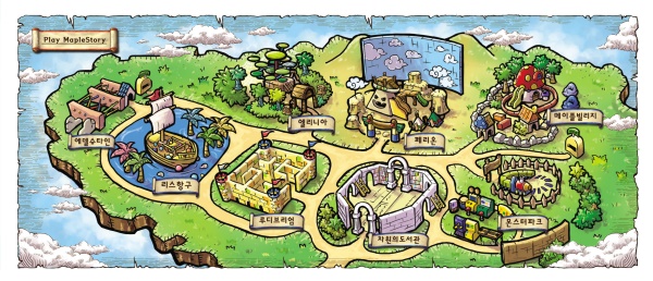 ... ‘플레이 메이플스토리’에서 펼쳐지는 공간은 게임의 맵처럼 디자인, 실제 게임 속에 등장하는 항구, 숲, 암벽, 블러 마을, 지혜의 성, 마을, 사파리 등 다양한 콘셉트로 꾸며졌다. 이 행사의 전시 공간은 크게 신체 및 두뇌놀이를 즐길 수 있는 공간인 다섯개의 메인 스테이