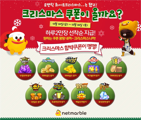 ... 이벤트 기간 동안 각 게임 별로 수정, 골드, 마구볼, 트로피, 메달, 보석 등 캐쉬 아이템이 매일 2만장씩 제공될 예정이다. 크리스마스 쿠폰 이벤트와 더불어 각 게임마다 다양한 이벤트도 준비됐다. RPG '몬스터길들이기'는 오는 25일 오후 8시부터 9시까지 게임에 접