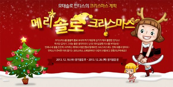 ... ‘ㅁㅌㅅㄹ’(모태솔로), ‘ㅁㅈㅇ ㅅㄹㅂㄷ’(무적의 솔로부대)로 구성되어 있는 자음 블록을 모아 문장으로 완성시키면 오만의 탑 보스들을 소환할 수 있는 ‘영혼석’, ‘극한의 무기/방어구’ 등 다양한 게임 아이템이 담긴 선물상자를 얻을 수 있다. 또 크리스마스 솔로 파티 초대장