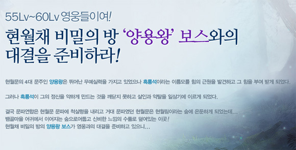 ... 이번 업데이트는 겨울 맞이 이벤트와 신규 지역 '현월림' 추가를 주요 골자로 한다. 겨울맞이 이벤트는 내달 15일까지 진행되며 '산타의 선물' '루돌프의 선물' 등 게임 내 아이템을 증정한다. 또한 새롭게 추가된 신규 지역 '현월림'은 55레벨 부터 60레벨에게 알맞은