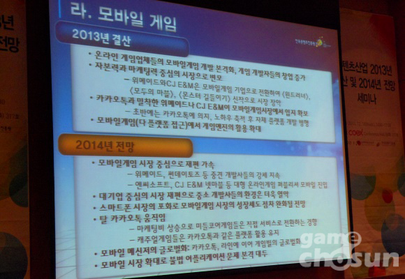 ... 특히 모바일게임을 중심으로 한 시장의 재편 또한 가속화될 것으로 내다봤다. 이중 대기업 중심의 시장재편으로 중소 개발사들의 환경을 더욱 열악해지는 동시에 모바일 시장 확대로 불법 어플리케이션 문제가 본격적으로 나타날 것이라고 지적했다. 권호영 수석연구원은 "대형