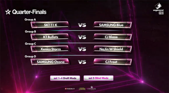 ... 이어진 조추첨에서 제닉스스톰(D조 1위)은 나진 화이트실드(C조 2위), 삼성갤럭시오존(C조 1위)은 CJ엔투스 프로스트(D조 2위)를 자신의 상대로 추첨하며 마무리됐다. 8강 첫 맞대결은 오는 25일 지난 시즌 우승팀 SK텔레콤T1 K와 삼성갤럭시 블루의 맞대결로 펼쳐진다