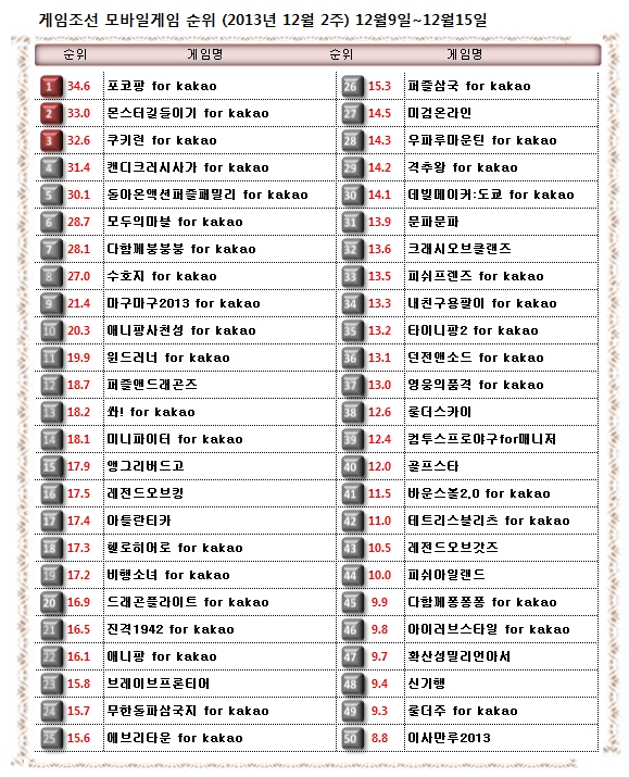 ... 12월 둘째 주(2013년 12월 9일 ~ 2013년 12월 15일) 모바일게임 순위입니다. 12월 둘째 주 모바일게임 순위에서‘포코팡’과 ‘몬스터길들이기’ ‘쿠키런’이 치열한 접전을 별였습니다. 게임조선 모바일게임 종합 점수에서 ‘포코팡’은 34