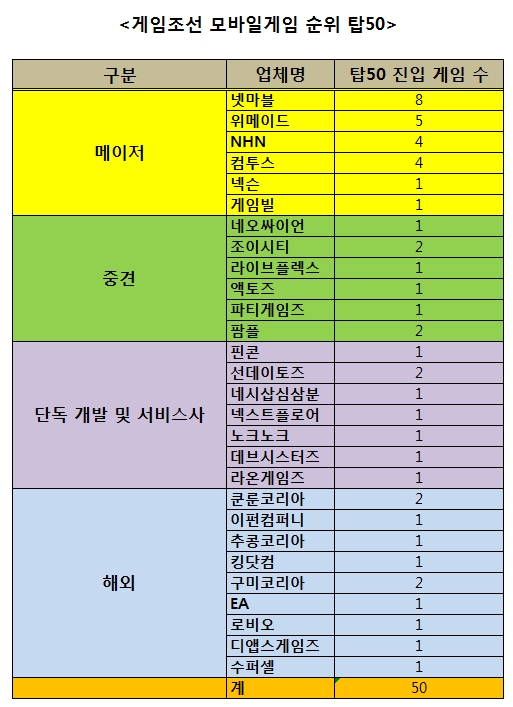 ... 중견 퍼브리셔인 네오싸이언, 조이시티, 쿤룬, 라이브플렉스, 액토즈, 파티게임즈, 팜플의 게임까지 합치면 31개로 중견이상 퍼블리셔가 모바일게임 탑50에서 차지하고 있는 비율은 탑50의 62%다. 이밖에 해외에 본사를 두고 있는 게임사인 쿤룬코리아, 이펀컴퍼니, 추콩코리아