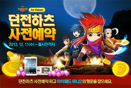 ... 이번 사전 예약 이벤트는 오늘부터 정식 출시 전까지 진행될 예정이며, 본인의 스마트폰 번호를 등록하면 '던전하츠' 출시에 맞춰 다운로드 정보를 SMS로 받을 수 있다. 또 사전 가입 신청자 전원에게 5000원 상당의 유료 아이템 '루비'를 지급하고 추첨을 통해 아이패드 미니2