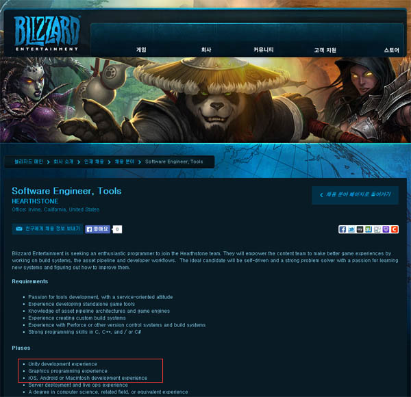 ... 특히 툴 소프트웨어 엔지니어는 하스스톤이 블리자드 게임 가운데 최초로 유니티엔진으로 개발된 만큼 유니티 개발자를 우대하고 PC와 아이패드 버전에 이어 안드로이드 플랫폼 확장을 위해 안드로이드 유경험자를 찾고 있다. 한편 블리자드는 지난 11월 블리즈컨을 통해 하스스톤의 서비스