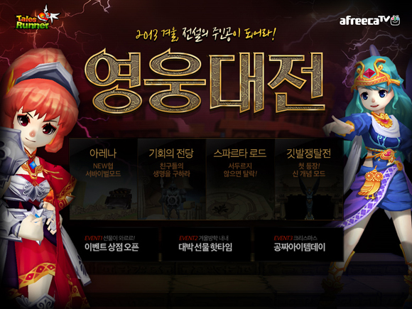 ...co. kr)’의 오는 12일 겨울 업데이트를 앞두고 티저 페이지를 오픈하고 다양한 사전 이벤트를 실시한다고 밝혔다. 이번 겨울 업데이트는 이용자가 직접 영웅이 되어 게임 속 동화나라를 구하게 된다는 스토리를 바탕으로 △아레나 △기회의 전당 △스파르타 로드 △깃발쟁탈전 등 4