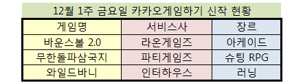 ...0'을, 인터하우스는 변신하는 달리기게임 '와일드바니'를 들고 나왔다. 카카오 게임하기는 매 주 화요일과 금요일 두 차례 신작을 선보이고 있다. 이번 주에는 화요일 7종, 금요일 3종으로 총 10종의 신작이 출시됐다