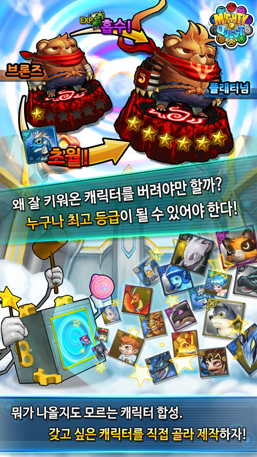 ... 총 10가지 종족, 200여 개 캐릭터는 등급 상승과 함께 외형이 변경되는 등 시각적 재미도 구현됐다. 김남석 오올블루 대표는 “홍수처럼 쏟아지는 양산형 TCG와 캐릭터 수집 게임에 싫증난 게이머분들에게 ‘마이티퀘스트’를 권한다”며 “이미 1만명이 넘는 유저분들의 혹독한 테스트