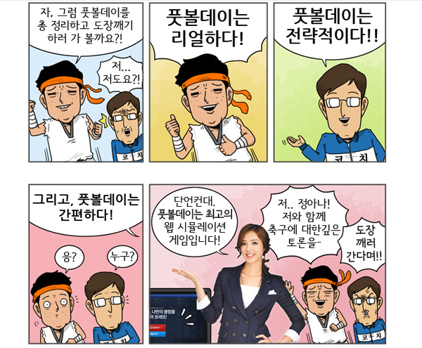 ... 먼저 조석의 '풋볼데이브레이커'는 월요일에 연재되는 웹툰으로 주인공과 매형, 축덕녀, 팀장, 사장 등 다양한 캐릭터가 등장해 일상생활과 풋볼데이가 조화된 이야기가 펼쳐진다. '칼카나마의 풋볼데이'는 총 9화로 이뤄진 웹툰으로, 만화가 칼카나마와 담당자가 등장해 게임의 특징