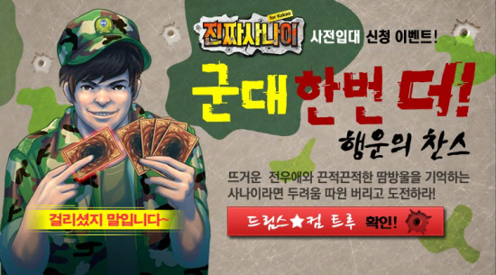 ... 특히 위트 있는 멘트를 비롯해 터치와 슬라이드 방식의 쉬운 조작법을 도입, 높은 대중성을 자랑한다. 게임빌은 내달 1일까지 사전 예약 이벤트를 진행, 신청자 전원에게 한정판 S급 지휘관 카드와 게임머니인 건빵을 제공한다. 한편 진짜사나이는 다음달 초 카카오 게임 플