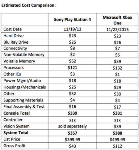 ... 이 매체에 따르면 PS4 본체의 부품 원가는 339달러, X박스 원은 331달러로 근소한 차이를 나타냈다. 컨트롤러와 카메라를 포함할 경우 PS4가 357달러, X박스 원이388달러로 늘어났다. PS4는 X박스 원과 달리 카메라 시스템을 별도로 구입해야 하기 때문에 31달러