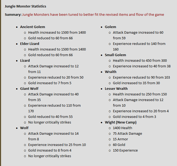 ... 정글 챔피언은 시즌3에서 게임 초반에는 뛰어난 스킬 피해량과 기본 능력치로 인해 강력함을 뽐냈지만 중반으로 접어들 수록 서포터와 비슷한 역할(방어아이템 위주의 지원 형태)을 수행했다. 이에 라이엇은 시즌4 프리시즌에서 정글 몬스터에 레벨을 적용해 시간이 흐를 수록 추가 골