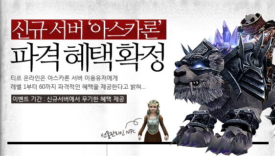 ... 또한 40레벨 달성 이후 10레벨 상승 시 마다 2배 경험치 부적을 증정하고 끝으로 60레벨을 달성할 경우에는 8강 무기를 지급할 예정이다. 액토즈 온라인사업본부 최용수 실장은 "티르온라인의 신규서버 ‘아스카론’에서 준비한 파격적인 이벤트 혜택과 함께 게임을 더욱 쉽고 재