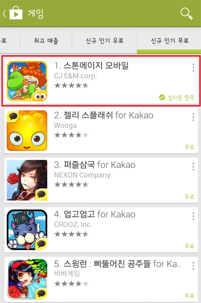... 21일 현재 스톤에이지 모바일은 신규인기무료 1위, 인기무료 2위, 최고매출 18위를 기록하는 등 넷마블표 모바일게임의 저력을 보여주고 있다. 넷마블 한지훈 본부장은 "초반부터 많은 이용자들의 참여가 이어지고 있어 '마구마구2013', '모두의마블'에 이어 온라인게임 IP를