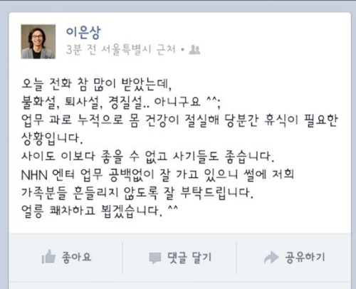 ... 특히 그는 "빨리 쾌차하고 돌아오겠다"고 강조하며 일련의 루머를 일축했다. 한편, 이날 오후 업계사이에서는 이은상 대표가 건강상의 이유로 장기휴가를 제출, 대표직을 사임하는 것 아니냐는 의혹이 불거진 바 있다. [류세나 기자 cream53@chosun