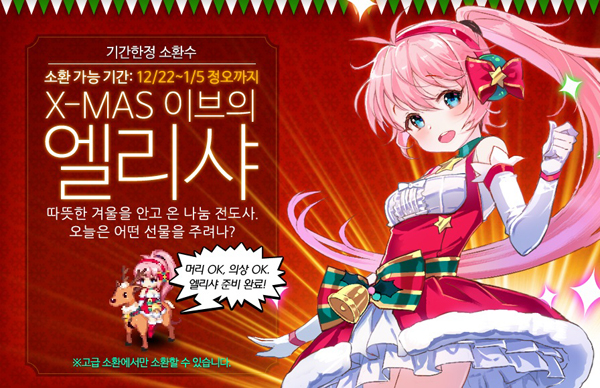 ... X-Mas 엘리샤는 오는 2016년 1월 5일까지 소환할 수 있으며 같은 기간 동안 엘리샤의 스토리 던전도 체험할 수 있다. 엔트리브소프트는 다음달 5일까지 ‘추위타는 눈사람 던전’에서 스테이지 별로 획득할 수 있는 3종류의 재료카드를 사용해 진화에 성공하면 이벤트 소환수 ‘