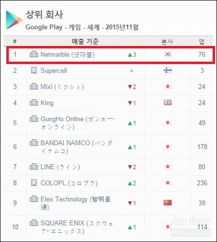 ... 또 구글플레이 게임 앱 매출 순위에서는 넷마블의 모바일 RPG(역할수행게임) ‘세븐나이츠’가 10위에 올랐다. 12월 현재 대만과 태국 등 아시아 주요 국가 매출 상위 10위권에 ‘모두의마블'과 ‘세븐나이츠’, ‘마블 퓨처파이트’ 등 넷마블 모바일 게임들이 자리하고 있으며