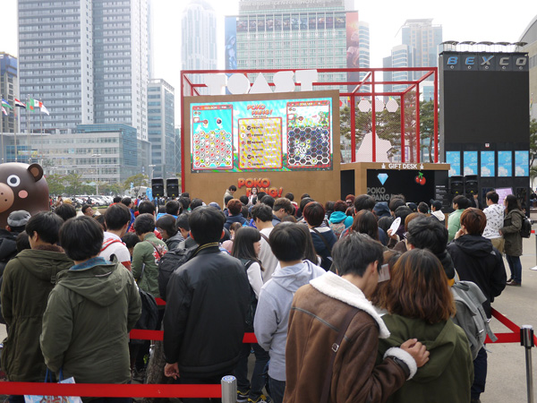 ... 이번 지스타에서 포코팡 야외이벤트 부스는 관람객들의 필수 코스로 인정받았다. 벡스코 인근 센텀시티 지하철 역에서 지스타 행사장 출입구로 이어지는 동선 상에 포코팡 부스가 자리하며 남녀노소 할 것 없이 포코팡을 즐기기 위해 긴 행렬을 이뤘기 떄문이다. 캐릭터 상품도 게임